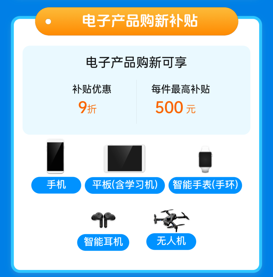 购买手机、平板(含学习机)、智能手表(手环)、智能耳机、无人机等5类电子产品,按最终销售价格10%补贴,每件最高500元。