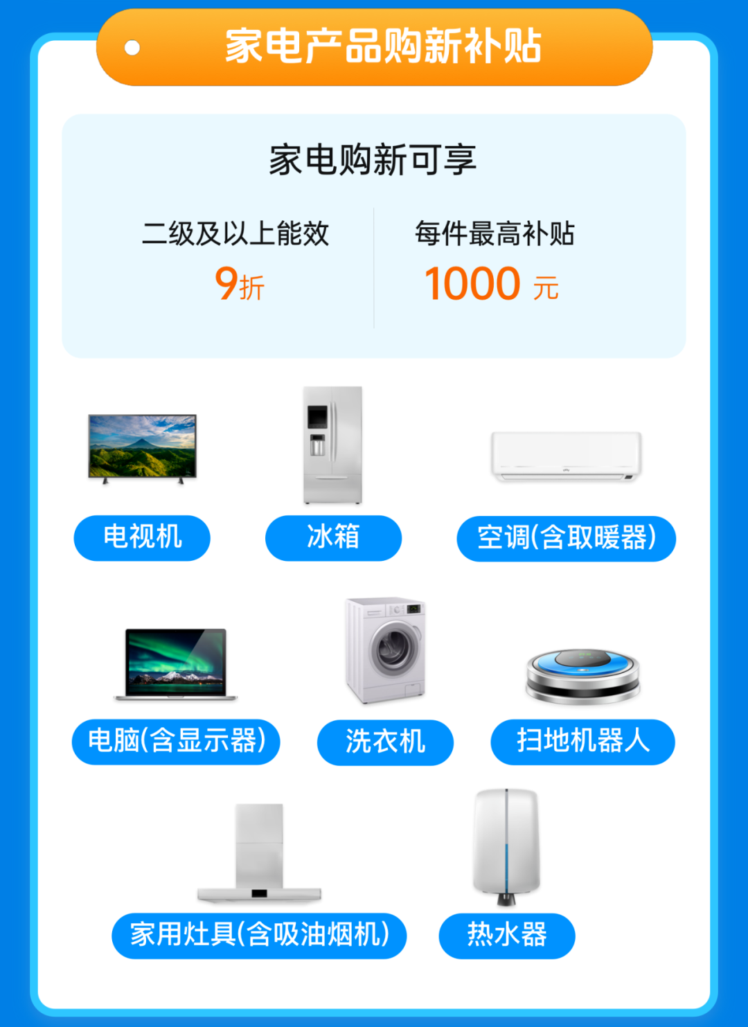 购买电视机、冰箱、空调(含取暖器)、电脑(含显示器)、洗衣机、扫地机器人、家用灶具(含吸油烟机)、热水器等8类二级及以上能效家电产品,按最终销售价格10%补贴,每件最高1000元。